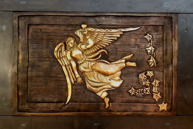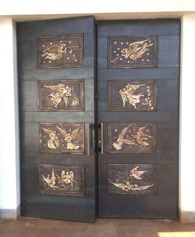 The door panels, designed and sculpted by Florence Wangui, are based on two aspects of the Rosary. The Joyful and the Luminous Mysteries. Following the